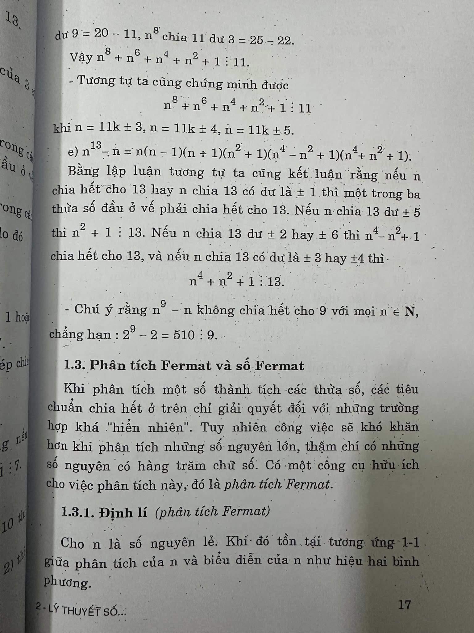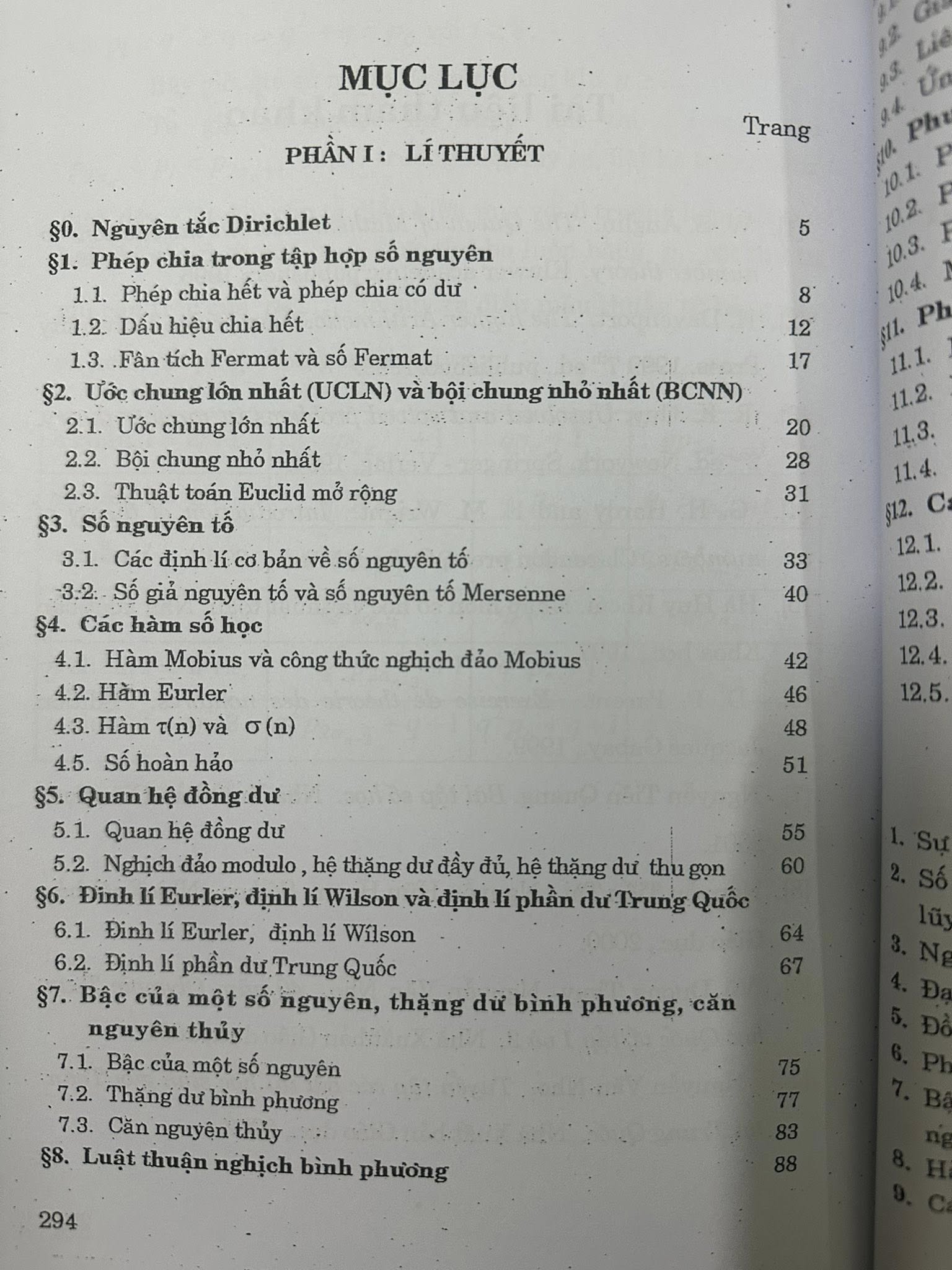 • Đồng dư thức: Một trong những phần quan trọng nhất, bao gồm định lí Euler, định lí Wilson và định lí thặng dư Trung Hoa (Chinese Remainder Theorem).